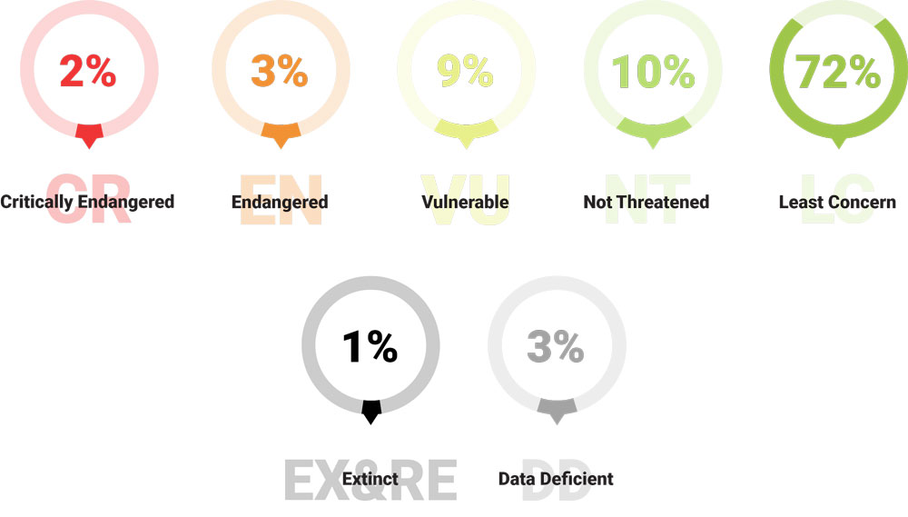 The IUCN Mammal Assessment1 includes 231 species of mammals, of which 23 are marine.