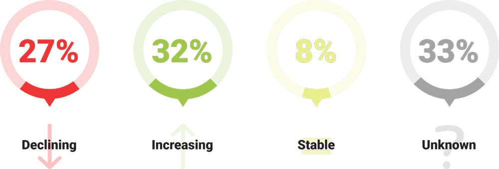 More than a quarter (27%) of European mammal species have population declines. Because trend information is not available for a third of Europe’s mammals, many other species may be at risk. Only 8% of species are increasing, some of which have benefited from conservation actions.