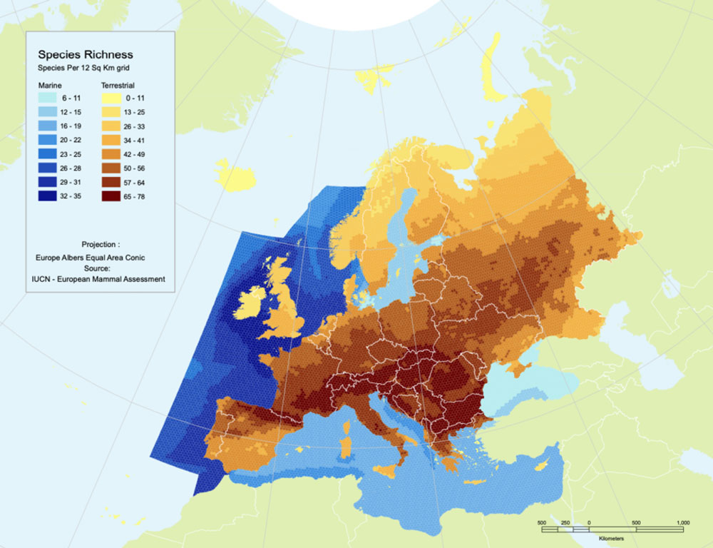 Europe and its waters are home to at least 299 mammal species. They include the world’s tiniest mammal, the Etruscan Pygmy Shrew, which weighs just 1.8g, to the Blue Whale reading up to 199 000 kg – the largest mammal ever to have lived. More than a quarter (26.5%) of the 260 land-dwelling species are found only in Europe. Terrestrial mammal biodiversity is greatest in south-eastern Europe (the Balkan Peninsula, Hungary, and Romania) and in the mountainous regions of Mediterranean and temperate Europe. Marine mammal diversity is greatest in the Atlantic seas bordering North-western Europe and Spain, where a variety of water depths are available.
