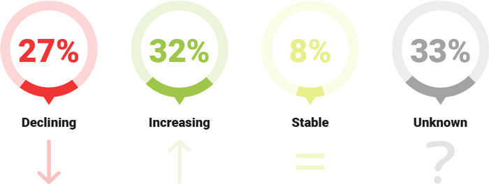 More than a quarter (27%) of European mammal species have population declines. Because trend information is not available for a third of Europe’s mammals, many other species may be at risk. Only 8% of species are increasing, some of which have benefited from conservation actions.